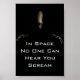 Este poster muestra, de la película "Alien", la gran y horrible criatura que produjo, así como la frase asociada con la película.