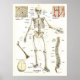 Gráfico anatómico que muestra los huesos del cuerpo. Vista anterior del esqueleto. Vista lateral de la columna. Sección transversal de hueso compacto. Los huesos están etiquetados.