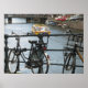 Las bicicletas de Ámsterdam estacionadas en el Puente de Ámsterdam, en el fondo un barco amarillo del canal con una bandera holandesa ondulante (roja, blanca, azul) en el canal con reflexiones de luz solar en la imprenta del Poster de agua. Una Gran Foto Atmosférica Holandesa, ¡Personalizable completo! ¡Añade tus propias imágenes y textos si quieres!