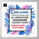 El Poster Vacunated All Employees Business Welcome Sign le dice a todos que sus empleados en su empresa están vacunados y que sus clientes deben llevar su máscara. Excelente información para cuando todos caminan por la puerta. Personalízalo con tu información.