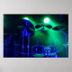 Cimballos iluminados en un escenario niebla con un lavado verde.