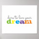 Este inspirador poster de texto de la cita colorida se ha atrevido a vivir su sueño en un diseño de fondo gris oscuro de carbón vegetal para la decoración de arte en la pared en casa o en la oficina. Derechos de autor del arte original Ann Powell, todos los derechos reservados.