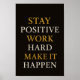 Sigan inspirados con este elegante y motivacional arte en la pared que presenta la frase "Mantente positivo, trabaja duro, hazlo realidad". Diseñado con un estilo moderno y limpio, es ideal para espacios de trabajo, aulas o salones.