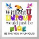 Como adulto, me doy cuenta de que no podemos simplemente decirles a los niños/jóvenes lo importante que es "ser tú mismo". Probablemente no habría escuchado; sin embargo, veo ahora que fui afortunado no tanto por tomar una postura o por ser independiente; sin embargo, en cierto modo pasé por la vida centrada en lo que era mi cosa en ese momento, así que funcionó bien. En lugar de ser el animador (que es algo grandioso) que quería salir con mi novio de secundaria que era el BMOC, yo estaba en el equipo de debate, corrí pista, un artista, etc. que salió con el BMOC todo durante la secundaria... y era la princesa que se iba a casa. En mi primer colegio (para mujeres en Va.), para llegar a mi clase de inglés de las 8:00, pasé por encima de la mitad de mis amigos que se inspiraron para protestar después de que Gloria S. nos sermoneó (y yo fui uno que tuvo chocolate caliente con ella la noche anterior)...... En lugar de ir con la multitud, quería mi A en esa clase que había ganado. No era intencionalmente "único"; más bien, simplemente hice las cosas a mi manera. En mi segunda universidad en Az, fui el único miembro de la hermandad en el departamento de arte y el único especialista en arte en la hermandad. Fue fácil para mí, y no sé por qué... Me golpeó mientras escribía esto, tal vez fue confianza. Así que.... punto siendo, tal vez si al menos podemos recordarnos a nosotros mismos (especialmente como profesores donde los niños están rodeados de compañeros) de hacer saber a cada niño que cada uno es fabuloso por quién es, cada uno tiene una calidad especial (única) que viene de adentro en vez de de de compañeros, cada niño brilla por sus propios méritos... ¡construya esa confianza, y ojalá el niño se sienta cómodo siendo único! Sólo digo... :) A medida que envejecen, oirán con demasiada frecuencia que no hay yo en EQUIPO; sin embargo, la manera en que veo que es un buen equipo necesita individuos ÚNICOS. Los equipos deportivos necesitan el quarterback, la mitad, la parada corta, el lanzador (cada uno único). La corporación necesita al director general, departamento financiero, departamento de tecnología, ventas (cada una única) ... : ) ¡pagué los cargos de licencia extendida para usar cada imagen por usted! ... Disfruta. Gracias, Sharon Rhea Ford, NBCT - ART(www.zazzle.com/sharonrhea*) Por favor, ¡Marqueme y venga a Zazzle a través de mi enlace! ¡Gracias.