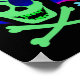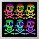 Patrón de seis cráneos y huesos cruzados en colores arcoiris. Cada cráneo tiene un ojo de arco iris y bandanas. Diseño de cráneo pirata colorido y simple para Halloween o en cualquier momento. El fondo y los colores de los bordes son personalizable.
