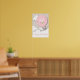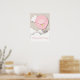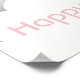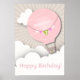 Poster de cumpleaños con un ilustracion de un globo de aire caliente rosa flotando sobre las nubes con fondo de explosión de sol. En Jill's Paperie hay invitaciones para fiestas de cumpleaños, pegatinas y más.