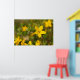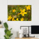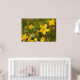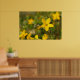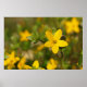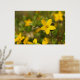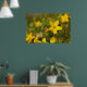 Una flor principal amarilla en foco con fondo amarillo y verde.