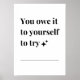 ¿Necesita un pequeño empujón para esforzarse más? Esta pieza de arte fue hecha para recordarte que no importa lo imposible que parezca lo que quieres lograr, tienes que intentarlo. Será su acompañante en su sesión de trabajo nocturno y le animará cuando quiera rendirse. Si al final de todo no obtienes el resultado deseado, sé feliz de haber intentado por ti. Puede solicitarlo como impresión o descargarlo e imprimirlo en su casa. Hazlo tuyo hoy ;) ¡Disfrútalo! **Este producto es únicamente para uso personal**