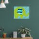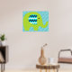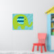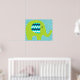 Un colorido poster infantil presenta un elefante verde limón brillante con orejas de rayas de chevron verde azuladas, blancas y navales y un fondo con rayas diagonales verde azuladas azules y blancas.