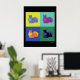 Una imagen de una ardilla fotomanipulada en un estilo de arte pop azul, verde, amarillo, naranja, turquesa y morado contra un fondo negro en un poster