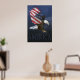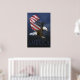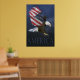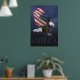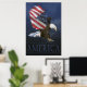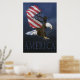 Dramático águila norteamericana con banderas de Estados Unidos como alas contra un cielo azul oscuro. Texto inferior "América". Por D. Bennett de Balance America.