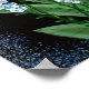 Poster de Flores Azules. Hermosas flores azules y blancas con tallos verdes y hojas sobre un fondo negro para cualquier habitación.