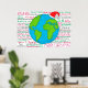 Este poster está impreso con un globo grabado a mano con un gorra festivo de Santa Cláusula. El fondo muestra el dicho "Feliz Navidad" en varios idiomas incluyendo inglés, español, francés, ruso, xhosa y más!