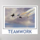 Cuatro miembros de los Ángeles Azules de la Marina de los Estados Unidos actúan en un programa aéreo público en San Diego. La palabra "TEAMWORK" en la parte inferior.