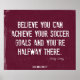 Este motivacional poster de fútbol presenta una inspiradora cita de fútbol sobre un denim desgarrado por el éxito de la aptitud física. La cita motivacional del futbol para los futbolistas, entrenadores y motivación del equipo hecha por el autor y diseñador Felicity Luckey dice: "Cree que puedes lograr tus goles de fútbol y estás a medio camino". ~ Felicity Luckey