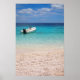 Poster de una lancha motora en el agua azul turquesa del mar mediterráneo en la pequeña playa blanca de Cala Goloritze en el Golfo de Orosei, Cerdeña, Italia.