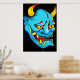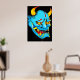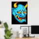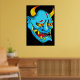 Este vibrante ilustracion representa la cara de un oni japonés, un demonio u otro ogro. El oni tiene una expresión feroz, con dientes afilados, ojos abultados y cuernos largos y puntiagudos. Su piel es azul brillante, contrastada con acentos rojos en la cara y cuernos. El fondo es negro, destacando la imponente presencia del oni.