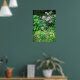 El poster de fotografía del jardín de verano muestra conflores moradas claras con centros naranjas y nasturtios rojos con follaje variado. Además, las hojas grandes de un arbusto hidrangea completan este poster floral vertical.
