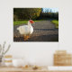 Fotografía de un pato macho Muscovy parado en la carretera con un árbol detrás de él.