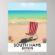Afiche de viajes por la playa de South Hams, Devon, Inglaterra. Poster de barandilla de postal devoto de una tumbona a rayas en una playa de arena devona.