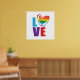 Poster cuadrado con temática de orgullo gay presenta una gran tipografía de LOVE colorida con corazón garabato arcoiris