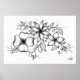 Esbozo de lápiz gráfico de tres flores de bonito, resaltado por hojas múltiples y vinas escarlatas. © Alina Davis 2014