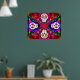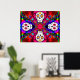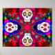 Día de las Calaveras Muertas flotando alegremente sobre fuegos artificiales psicodélicos. Esta es la página de julio de nuestro calendario del Día de los Muertos 2010.