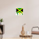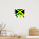 Tres futbolistas juegan frente a la bandera jamaiquina. Nombre del país Jamaica está del lado
