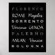 Poster de tipografía con ciudades de Italia y Sicilia: Florencia, Roma, Nápoles, Sorrento, Verona, Génova, Palermo, Milán, Venecia y Bolonia