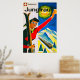 Poster de Viajes Vintage de Suiza. Afiche vintage que muestra a una mujer de la región de Jungfrau en Suiza sosteniendo un ski con un tren que viaja a través de las montañas suizas.