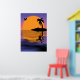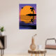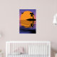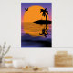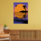 Poster de una puesta de sol tropical con un pájaro, una palmera y una flor en un islote en el agua. Una continuación perfecta de la serie Flamingo Sunset