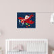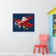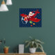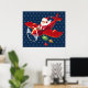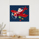 Santa volando un avión y tirando regalos envueltos. El fondo es un azul oscuro con poster de patrón de copos de nieve.