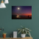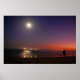 Un par de besos en una playa al atardecer. El sol se está poniendo y la luna y las estrellas están saliendo.