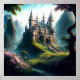 Este es un poster de un hermoso, imaginativo, clásico castillo de cuento de hadas en un exuberante prado verde con flores rosas. Se hizo usando Leonardo.ai.