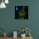 Poster de un tranquilo castillo de Tolkienesque Elven en un bosque sereno junto a un estanque al atardecer. Las luces de los hados iluminan el entorno. Imagen hecha con Leonardo.ai.