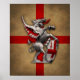 Criaturas parecidas a dragón y ataúd delante de una vieja bandera inglesa en poster. Los límites del centro histórico de Londres están marcados por estas marcas fronterizas de dragón en las principales entradas, originalmente para advertir a los viajeros y actuar como puestos de peaje. Están sosteniendo un escudo que lleva el escudo de armas de la City londinense, pintado de rojo y blanco. Cuando la Reina va a San Pablo, se detiene en Temple Bar (por una de las estatuas originales del dragón) antes de entrar en la Ciudad de Londres, para que el alcalde le ofrezca la Espada de Estado incrustada en perlas de la Ciudad como símbolo de lealtad.