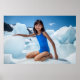 Un poster de tamaño natural de una imagen de una estudiante japonesa generada por IA. En medio de un paisaje glaciar helado.
