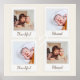 Celebra los momentos especiales de la vida con este Poster fotográfico de estilo polaroide - Agradecido y bendecido. Con cuatro marcos de fotos de personalizable, campos de texto editables y un delicado acento cardíaco, este diseño convierte a sus recuerdos familiares en arte mural atemporal. Perfecto para salas de estar, guarderías o como un regalo de corazón, este poster es ideal para el Día de Acción de Gracias, las vacaciones o la decoración cotidiana en casa que le recuerda estar agradecido y bendecido. 🍂 ✨ 🤍