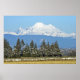 En este poster de personalizable, el Monte Baker, al este de Bellingham, WA, se eleva cubierto de nieve contra un cielo de invierno azul pálido, con colinas azules entre él y una línea de árboles verdes. Una nube de gansos de nieve, visitando en su migración invernal, huye contra los árboles oscuros y verdes. La franja blanca que cubre la hierba muerta del campo en el borde inferior de la foto no es nieve o agua, sino cientos más de gansos.