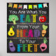 ¡ERES LO QUE COMES DESDE TU CABEZA HASTA TUS PIES! Cafetería imprimible o Poster de Salud para Comer Saludable para Almuerzo, Clínica de Salud, Oficina Escolar y Decoración de Cafetería! ¡Una forma bonita de añadir personalidad y una decoración luminosa y divertida a la sala de desayunos, a la sala de salud o a la cafetería de tu escuela! El poster cuenta con un falso fondo de pizarra con letras coloridas y divertidos gráficos personalizados de comida - impresiones hermosas!