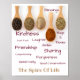 Este poster tiene cinco cucharas de madera con especias diferentes. Palabras por todo el poster de rojo burdeos ricos dicen "bendiciones, bondad, buena comida, risas, abrazos y besos, sonrisas, amistad, compartir, compañerismo, perdón, generosidad, buenas conversaciones", y, en el fondo, se lee "El sabor de la vida" en un cálido color de camello dorado sobre fondo blanco. Personalizar este poster o compra como diseñado. Fondo de imagen de stock www.freepik.com