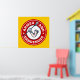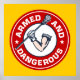 Diseño de Lacrosse - Poset armado y peligroso. Emblema circular de diseño lax del brazo muscular con palo de lacrosse en la mano del guante. Versión roja y amarilla. Regalo de lacrosse único de Guay para jugadores y fans de lacrosse.