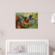 Esta impresión colorida ilustra un pájaro azul que descansa en una rama de un bosque lleno de flores. Esta vista muestra al pájaro a punto de tomar vuelo. Los colores azul claro, rosa, amarillo y verde hacen una imagen emocionante para la decoración y los accesorios personales.