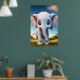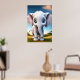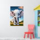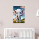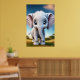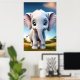 Poster de un bebe elefante lindo y animado con ojos grandes y expresivos parados en un campo de hierba bajo un cielo brillante. El elefante tiene una expresión alegre, adornado con colores pastel suaves que realzan su naturaleza lúdica.