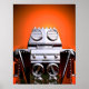 Robot de juguete vintage trenzado en 3d con fondo rojo fuerte.