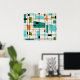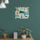 Este Poster Retro Grid y Starbursts es donde el estilo vintage se une a los tiempos modernos. El fondo es de color crema, con kitsch, cuadrados y rectángulos fuera de kilómetros en verde azulado, turquesa, azul claro, naranja y verde aguacate. Los bloques de color caprichosos se ven superpuestos en algunas de las intersecciones de la cuadrícula. También hay rectángulos negros con líneas verticales y horizontales negras formando un patrón de cuadrícula. Diseños y cuadrados de estallido negro colocados esporádicamente a lo largo de este tapiz de color moderno de mediados de siglo. Agarra tus botas de go y fondo de timbre y disfruta de esto hasta los años 60.