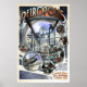 "Retropolis" es el nombre que le he dado a mi Futuro que nunca fue, y ahora también es el nombre de este salvaje montaje al estilo poster de películas de los lugares y personas que llenan el mundo. Reúne muchos elementos con los que había estado trabajando durante el año pasado -de hecho, creo que comencé la ciudad en sí unos tres años y medio antes de crear esta imagen- en una gran y alegre conglomeración de entusiasmo retro-futurista. Estoy bonito loco por eso, como tal vez puedas decir. Esta es una ciudad tan grande que tiene tiempo. Como en los patrones climáticos. No confundan la niebla con las nubes con la contaminación, ya que eso no es un problema aquí; la Ciudad del Futuro solía ser siempre sobre el transporte de un tipo elegante, moderno y deseable. Esto no es una excepción, con su desgarrador monorraíl y sus aviones de alto vuelo y más livianos que el aire - pero tampoco es todo transporte público, ya que nos prometieron volar autos. Aquí finalmente los tenemos en forma de cohetes de galletas abiertas que estallaron en el corazón de la imagen. Arreglados alrededor de la imagen central de la ciudad hay varias personas que pueden encontrarse ahí. Sin ninguna razón que pueda explicar, he nombrado a los personajes masculinos como líderes de bandas británicas de los años 20 y 30. Tenemos a Nat Gonella, Henry Hall, y Lew Stone, y en su propia vena está su amigo Aelectro Monica, junto con Rusty, la original Compañera de Robot Fiel. Para los que estamos a mi lado del agua también hay un guiño a los Gershwins, y hay al menos una sutil referencia a alguien que - hasta donde sé - nunca fue músico. Tendrás que encontrarlo por ti mismo.