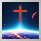 Cruz roja y dorada cerca de planetas de escape espacial. Creado mediante software de IA.