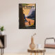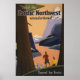 Visita el área del noroeste del Pacífico... Viaje en tren. Poster de viajes de época que muestra a un hombre y una mujer mirando a las montañas y a una ciudad a orillas del agua, entre árboles de secuoya, alrededor de 1925.