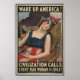 ¡Despierten América! Civilization Call es un poster vintage de guerra de 1917. Muestra a una mujer vestida de rojo, blanco y azul durmiendo con las palabras ¡Despierten América! encima de ella.